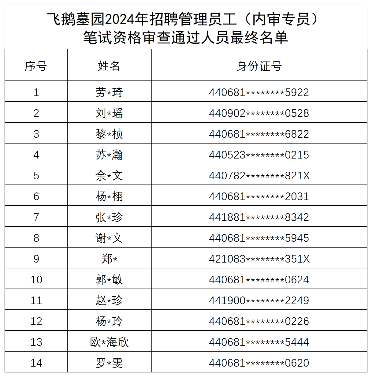 飞鹅墓园关于公布招聘管理员工(内审专员)笔试资格审查通过人员 最终名单的公告