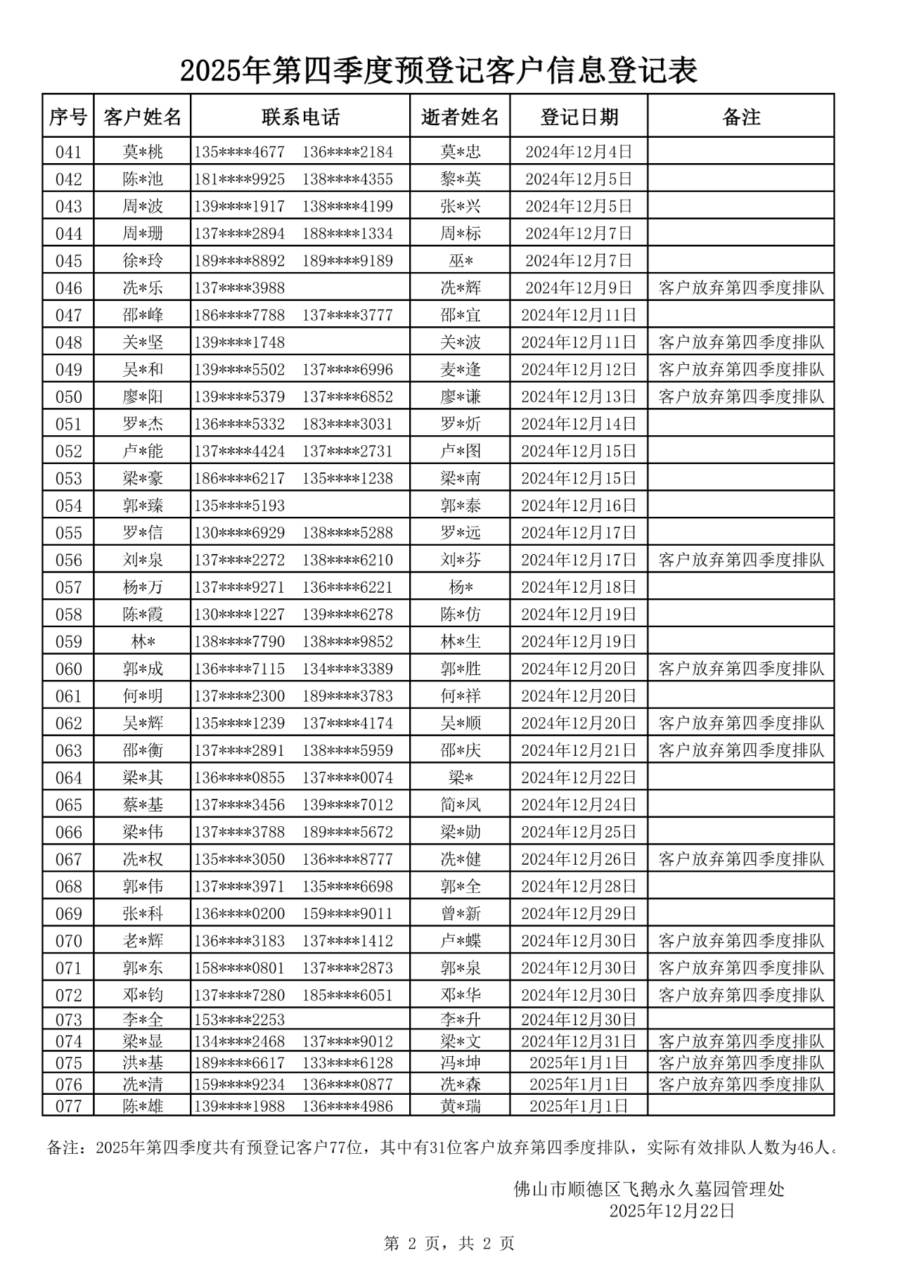 根据2025年12月22日统计的2025年第四季度墓位认购需求的预登记情况,共有77名客户进行了2025年第四季度墓位的需求预登记,其中有31名放弃2025年第四季度排队(其序号不计入2025年第四季度排队序列),实际有效排队人数为46人。根据墓园此前公布的预登记流程,该46名客户符合优先认购2025年第四季度推出墓位的资格,具体名单见附件。