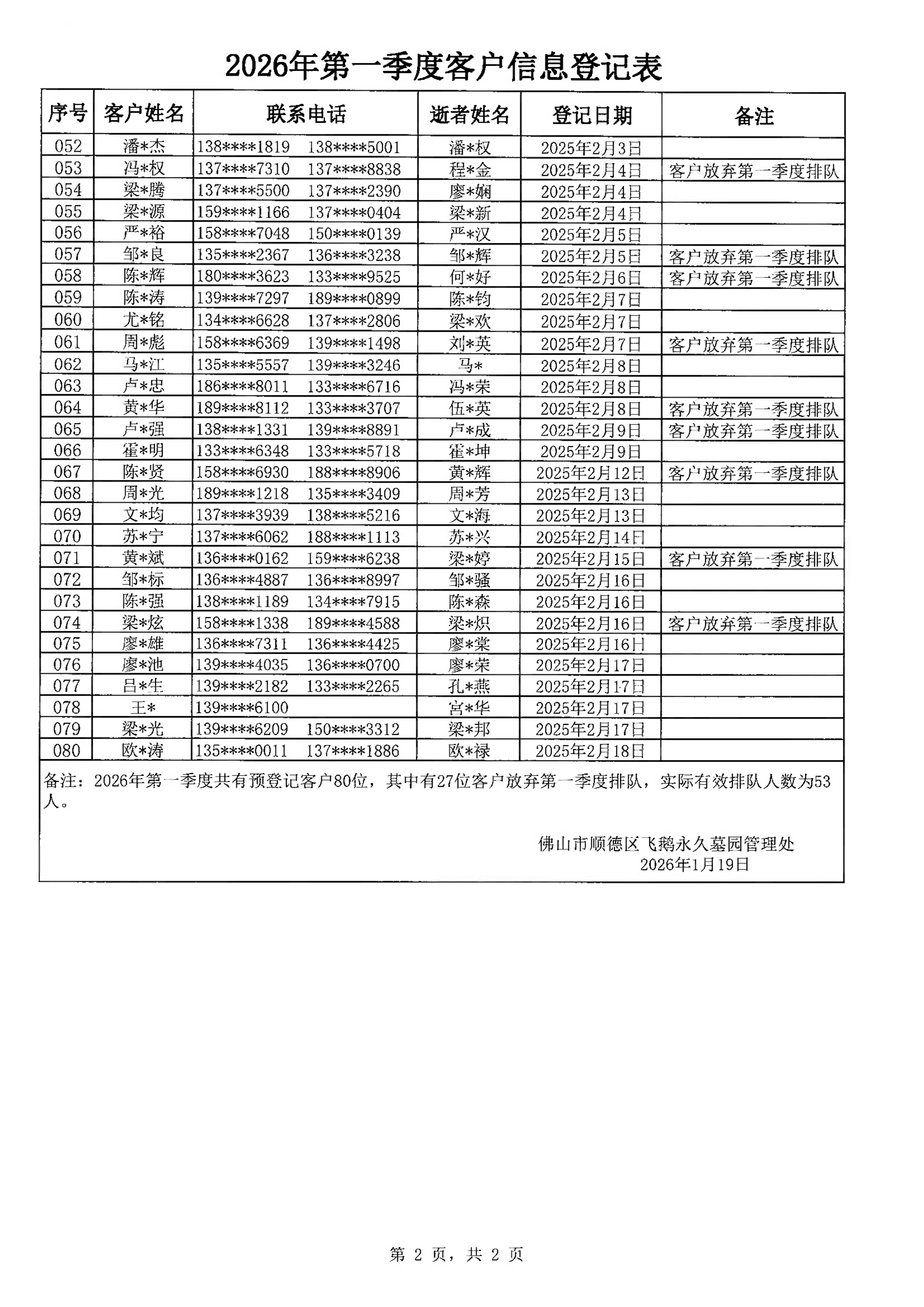 根据2026年1月19日统计的2026年第一季度墓位认购需求的预登记情况,共有80名客户进行了2026年第一季度墓位的需求预登记,其中有27名放弃2026年第一季度排队(其序号不计入2026年第一季度排队序列),实际有效排队人数为53人。根据墓园此前公布的预登记流程,该53名客户符合优先认购2026年第一季度推出墓位的资格,具体名单见附件。
