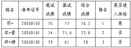 根据《佛山市顺德区飞鹅永久墓园管理处2026年上半年招聘管理员工公告》,我单位于2026年1月24日上午组织了面试,现将面试成绩、综合成绩和参加体检名单公告如下: 一、面试成绩和综合成绩