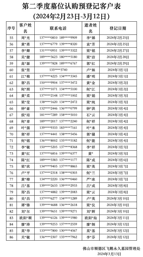 第二季度墓位认购预登记客户表 (2024年2月23日-3月12日)