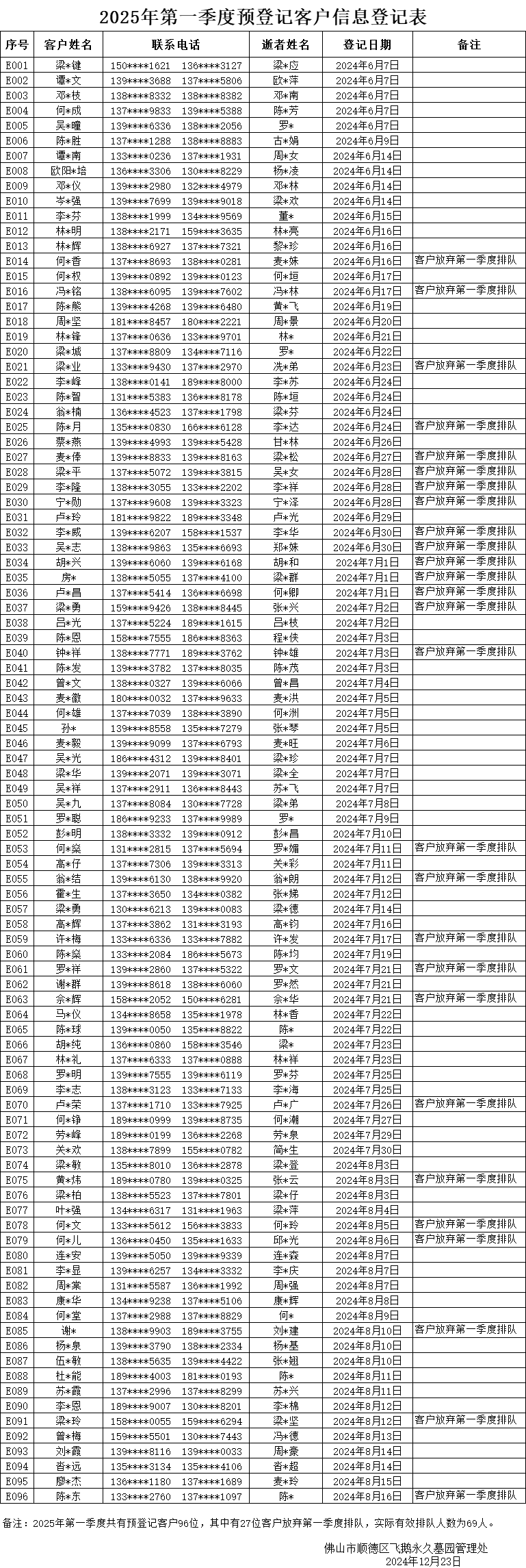 根据2024年12月23日统计的2025年第一季度墓位认购需求的预登记情况,共有96名客户进行了2025年第一季度墓位的需求预登记,其中有27名放弃2025年第一季度排队(其序号不计入2025年第一季度排队序列),实际有效排队人数为69人。根据墓园此前公布的预登记流程,该69名客户符合优先认购2025年第一季度推出墓位的资格,具体名单见附件。