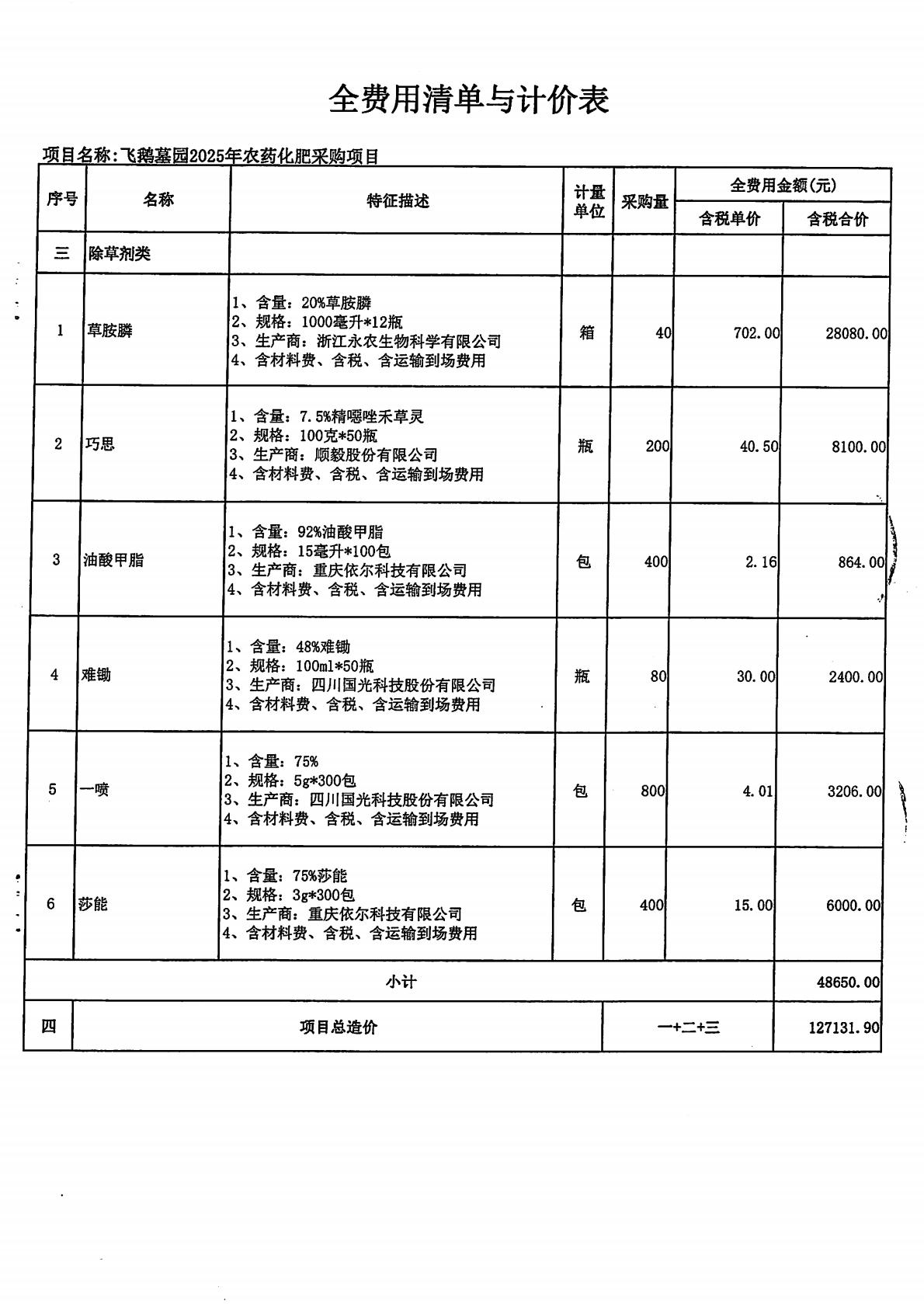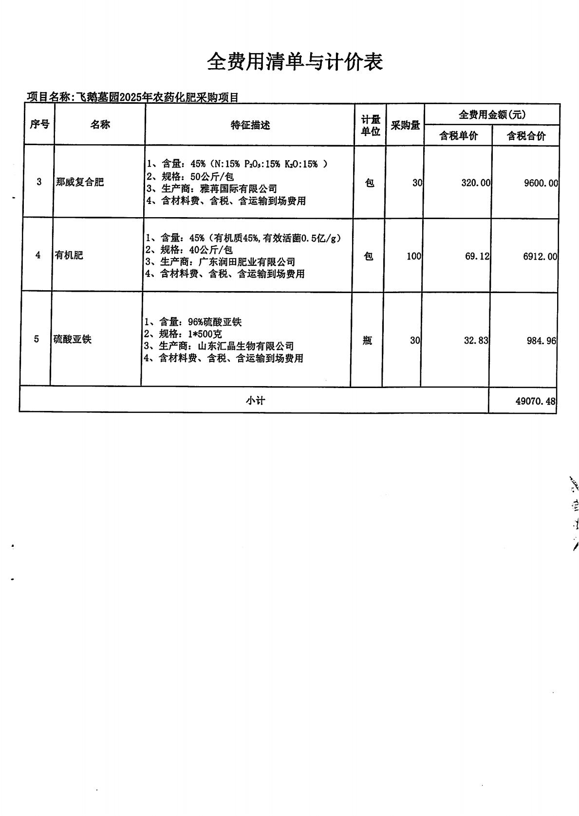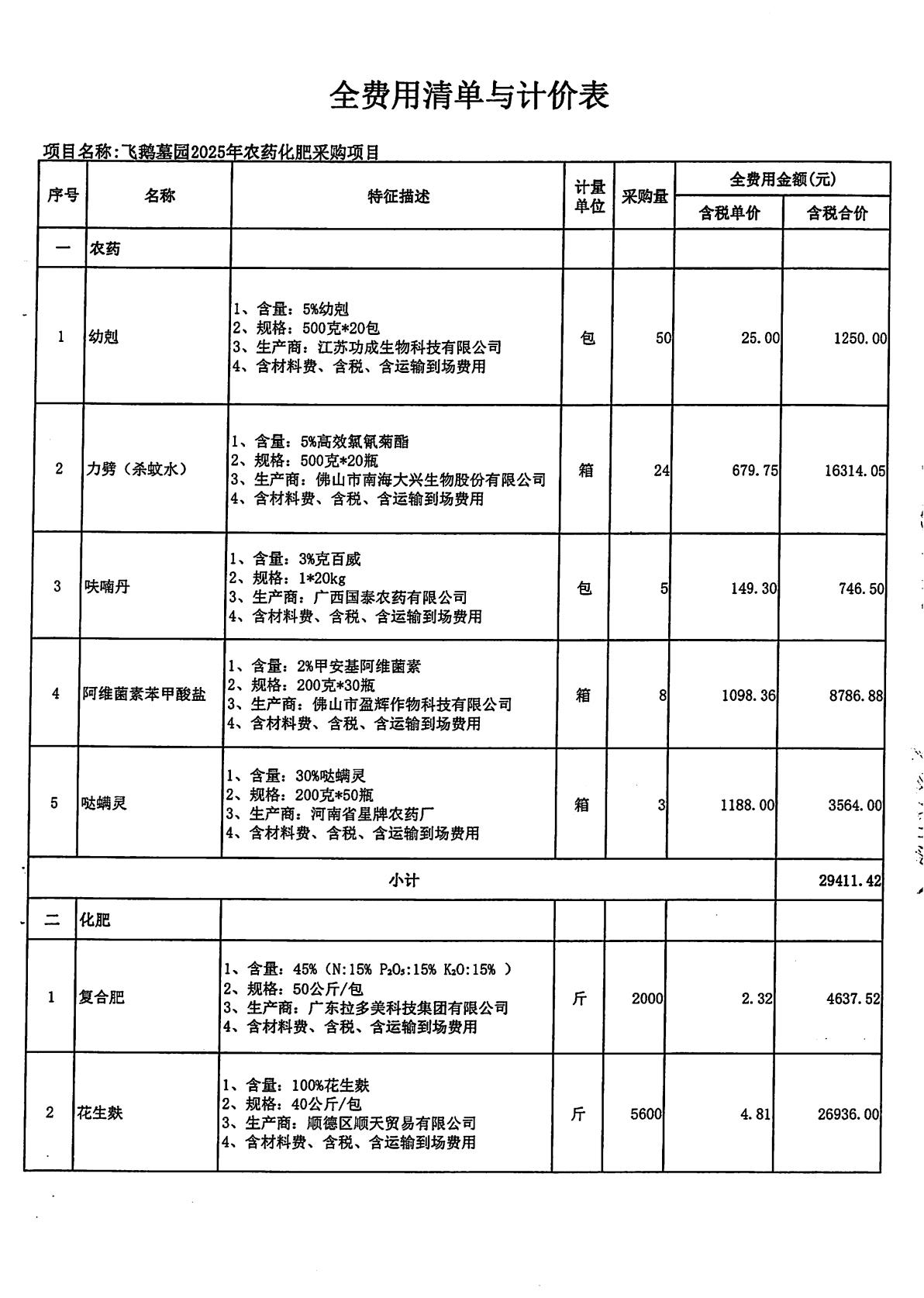 (三)本项目的报价采用“费用清单计价方式”(《飞鹅墓园2025年农药化肥采购项目全费用清单与报价表》,详见附件)。