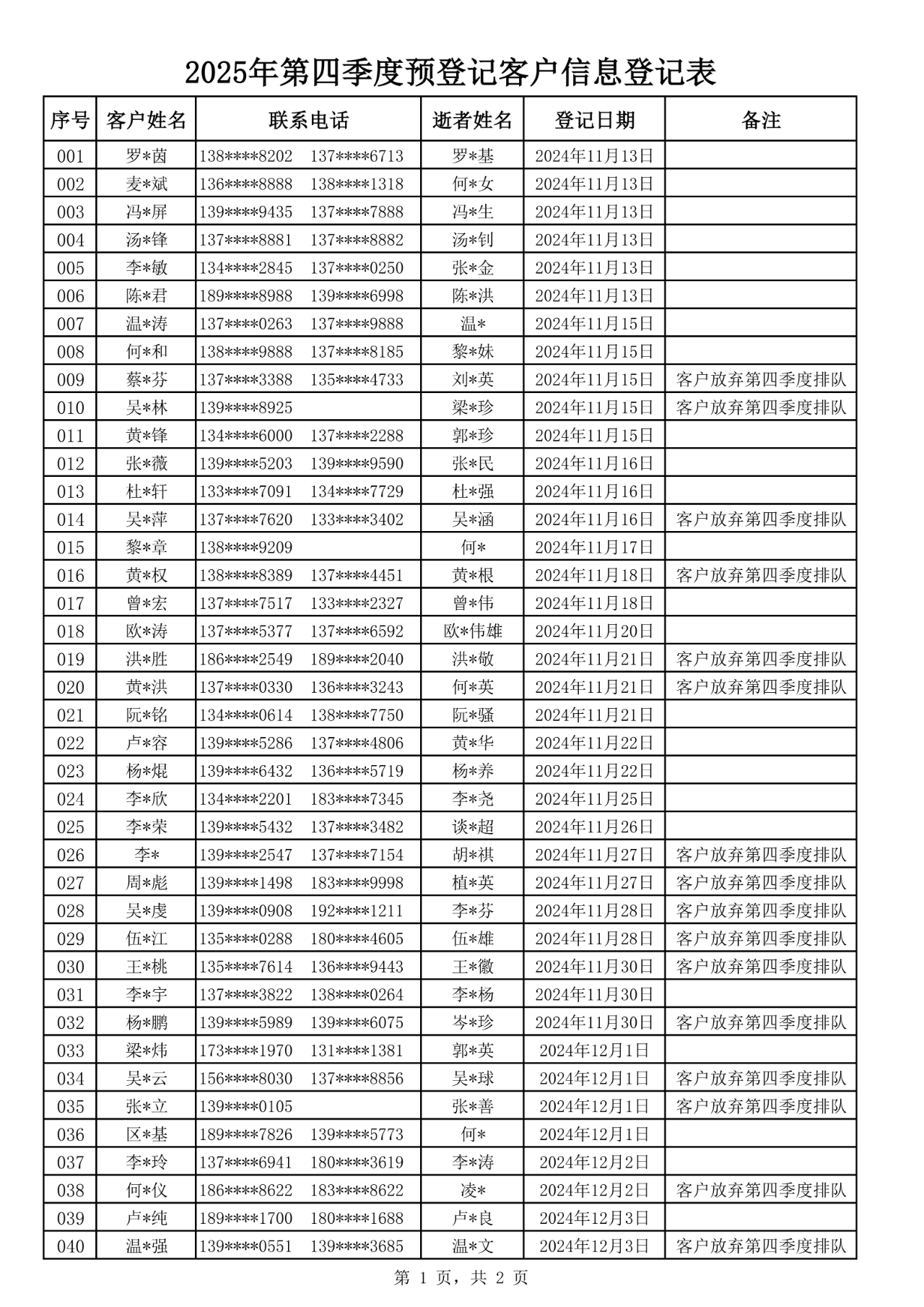 根据2025年12月22日统计的2025年第四季度墓位认购需求的预登记情况,共有77名客户进行了2025年第四季度墓位的需求预登记,其中有31名放弃2025年第四季度排队(其序号不计入2025年第四季度排队序列),实际有效排队人数为46人。根据墓园此前公布的预登记流程,该46名客户符合优先认购2025年第四季度推出墓位的资格,具体名单见附件。