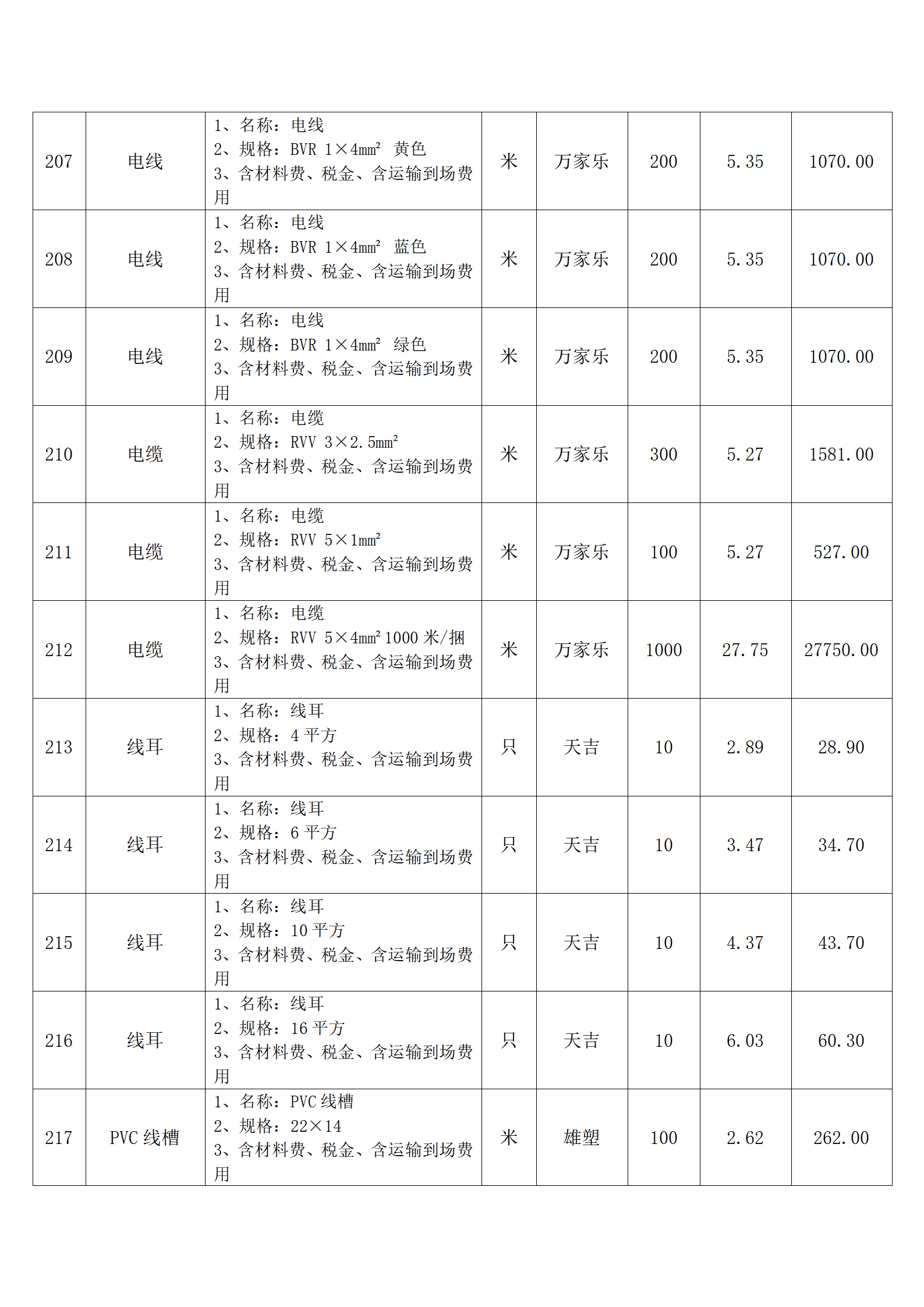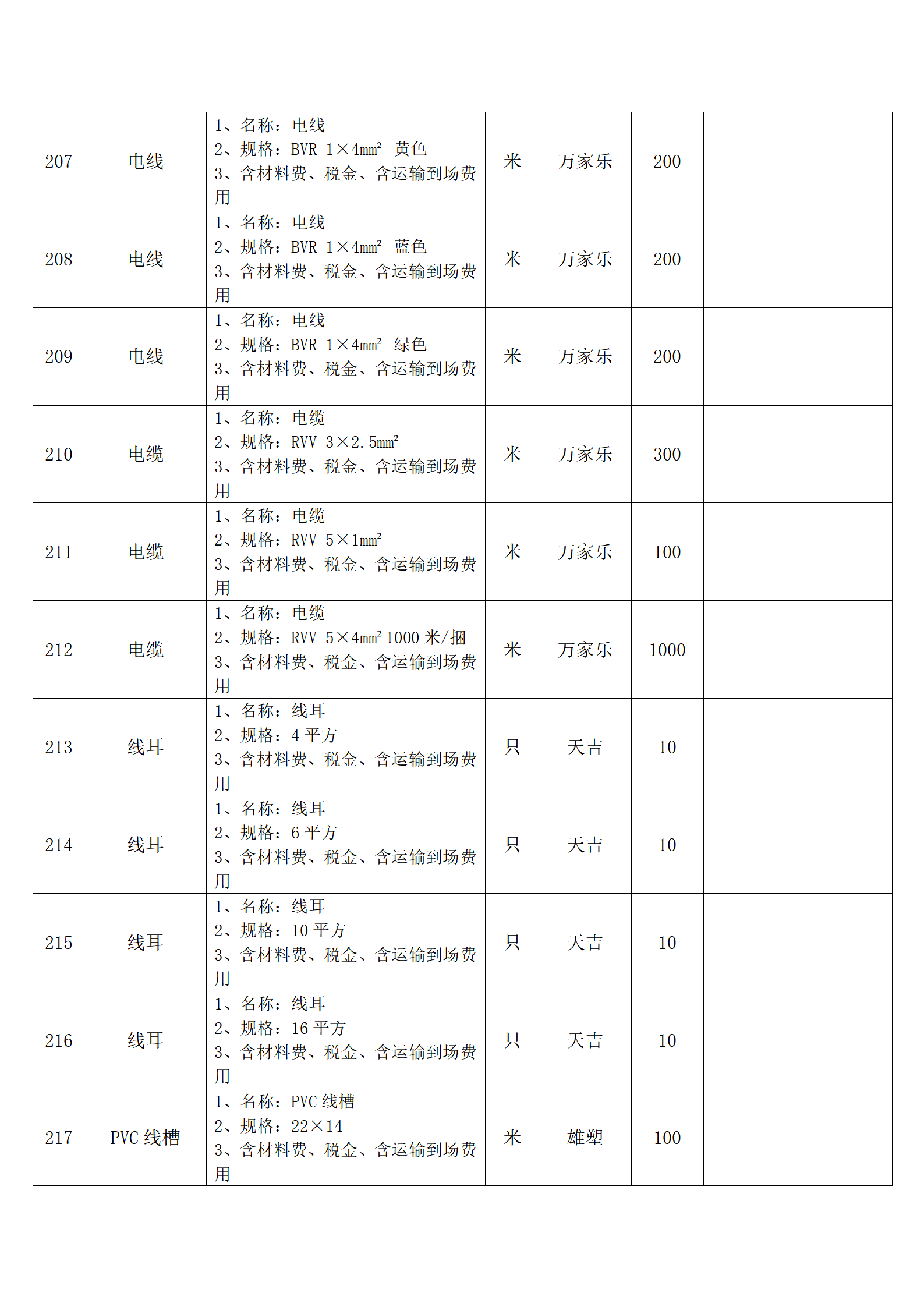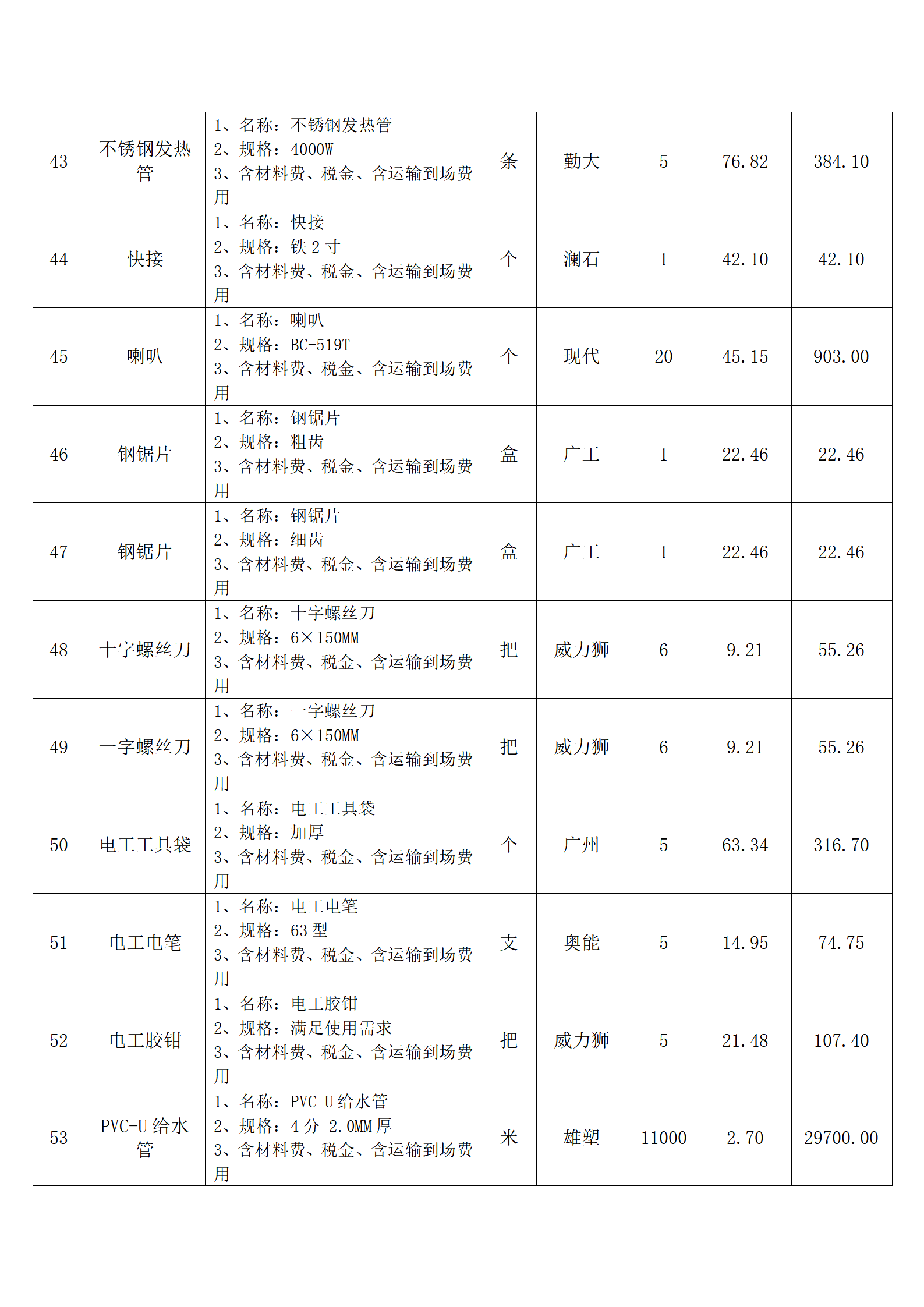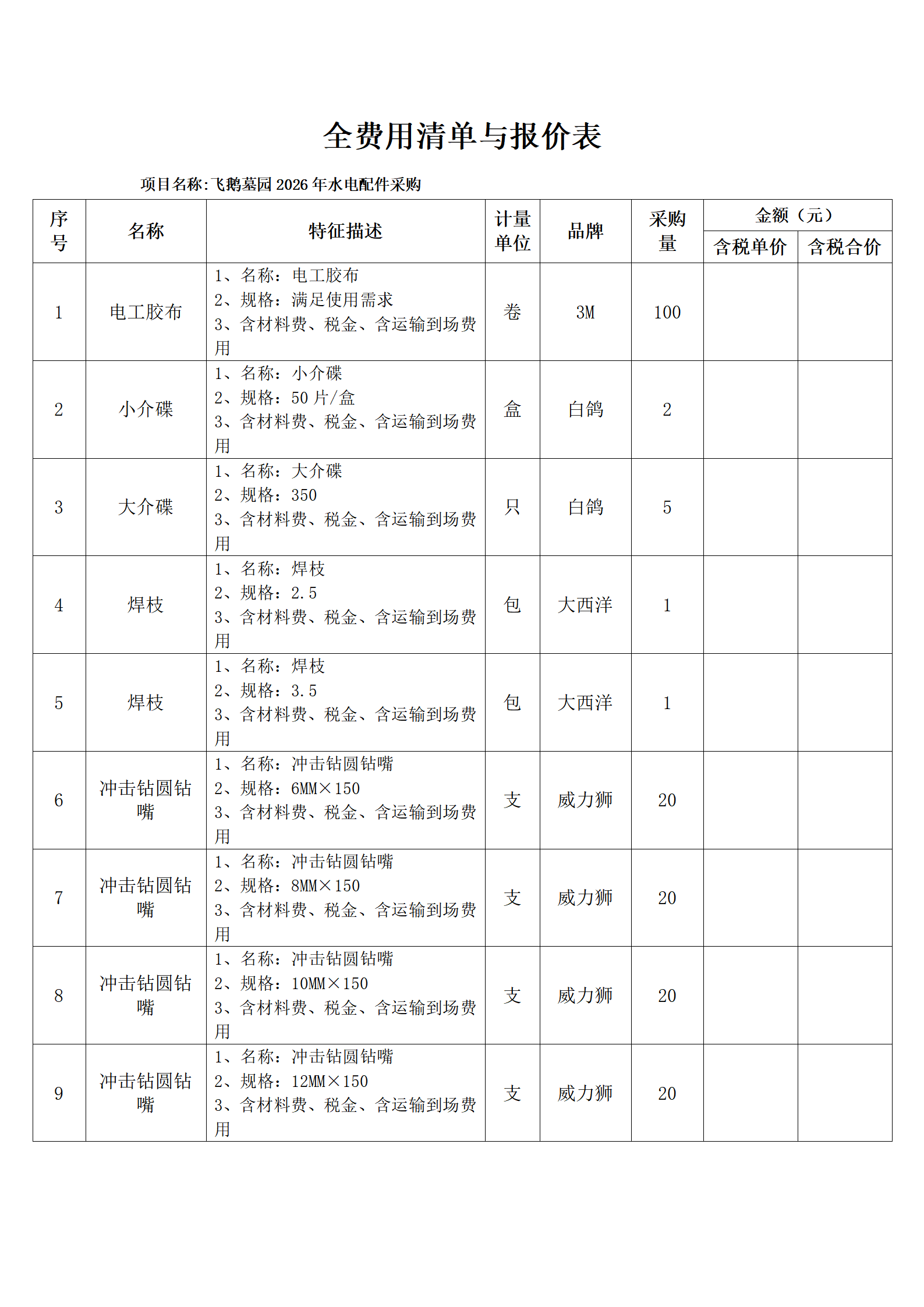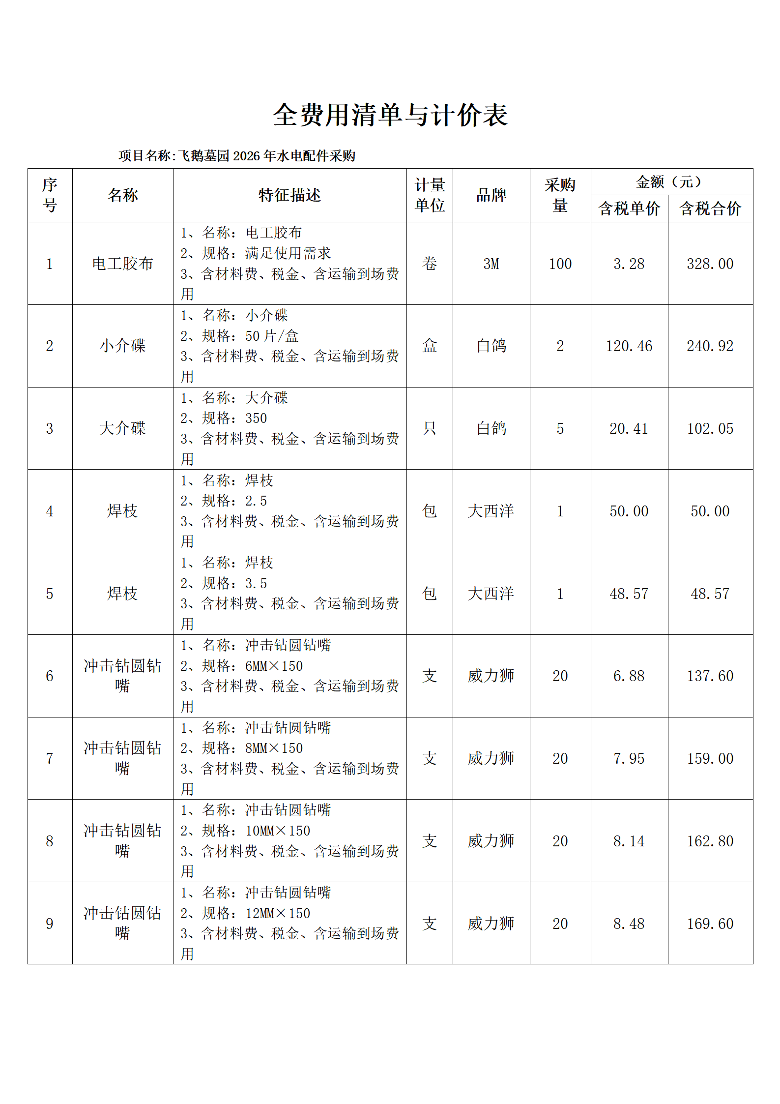 全费用清单与报价表中每一项都已指定品牌和采购量,报价人均不得更改。