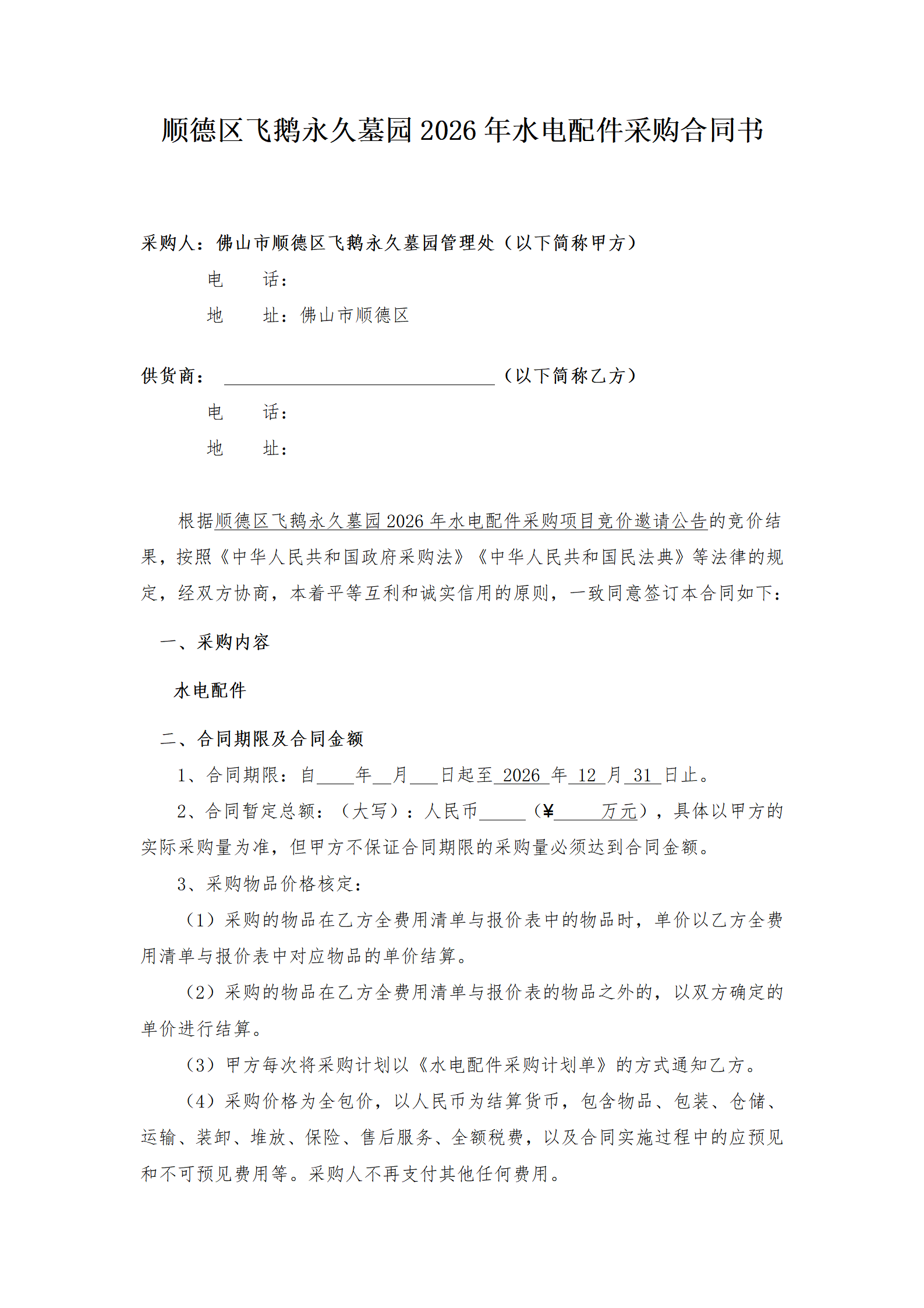 顺德区飞鹅永久墓园2026年水电配件采购项目