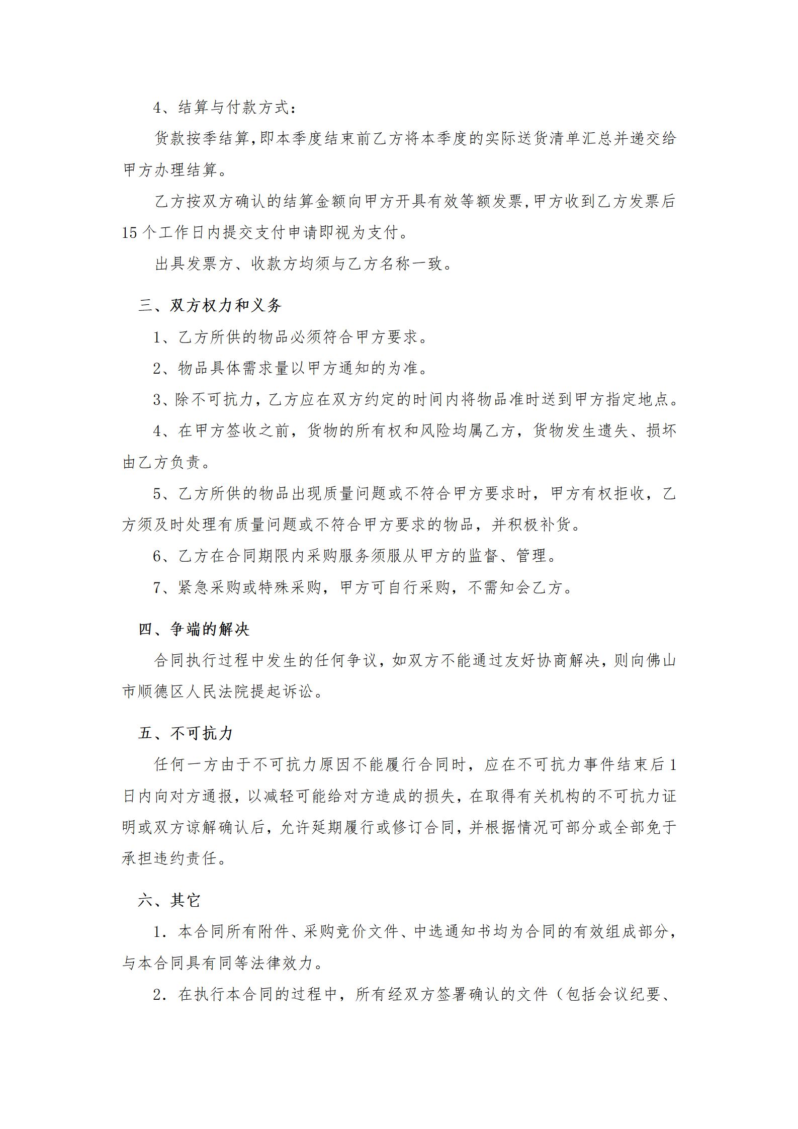 (十一)货款按季结算,即本季度结束前中选单位将本季度的实际送货清单汇总并递交给采购人办理结算。中选单位按双方确认的结算金额向采购人开具有效等额发票,采购人收到中选单位发票后15个工作日内提交支付申请即视为支付。出具发票方、收款方均须与中选单位名称一致。