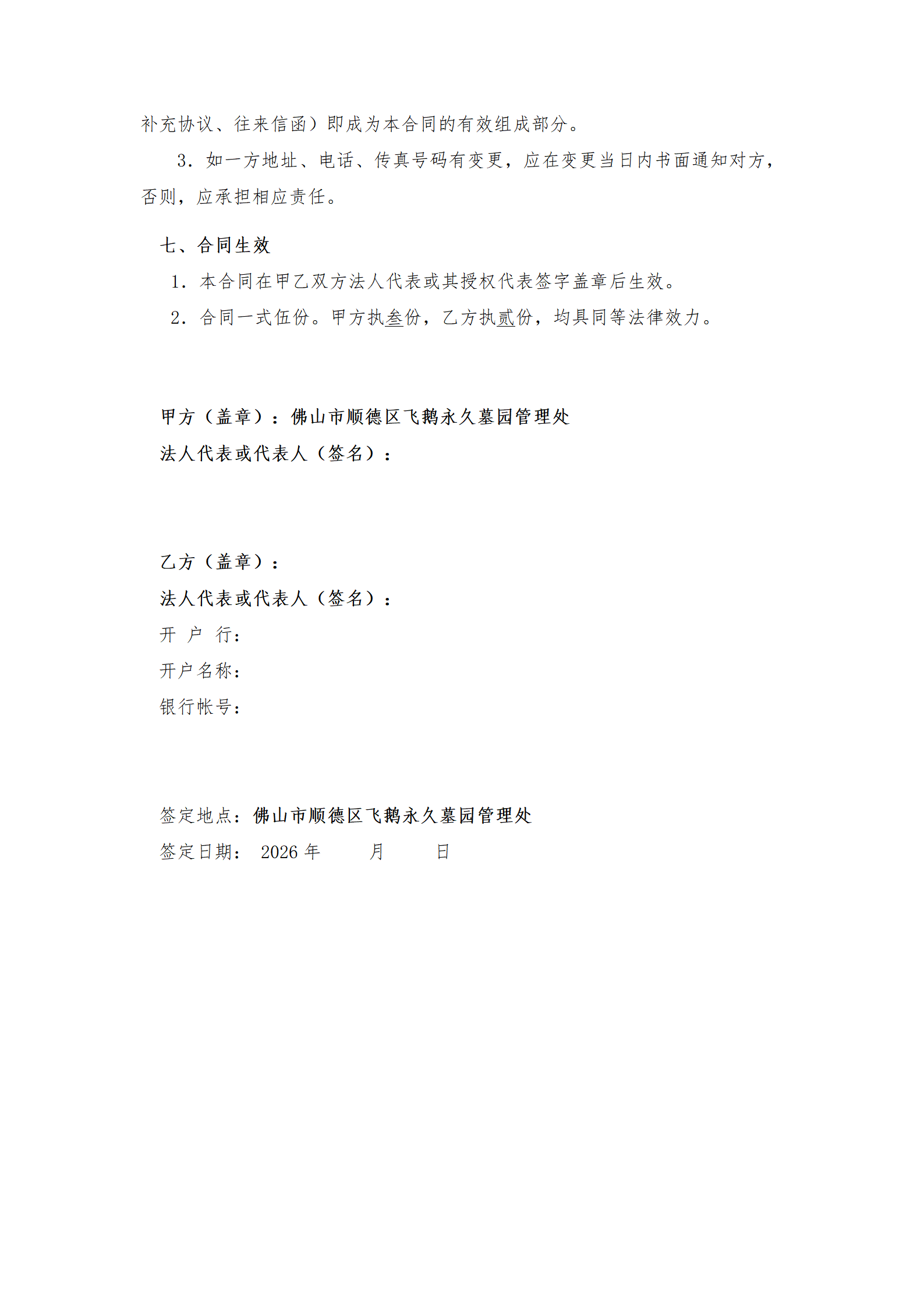 1、报价资料应包括以上内容并加盖公章,一式两份,提交时请以密封函件的方式递交至顺德区大良街道南国路顺德区飞鹅永久墓园管理处物管部,未密封的报价资料可能不被接受或视为无效;除以密封函件递交投标文件外,须同时用U盘携带一份投标文件的PDF格式文件到递交现场。